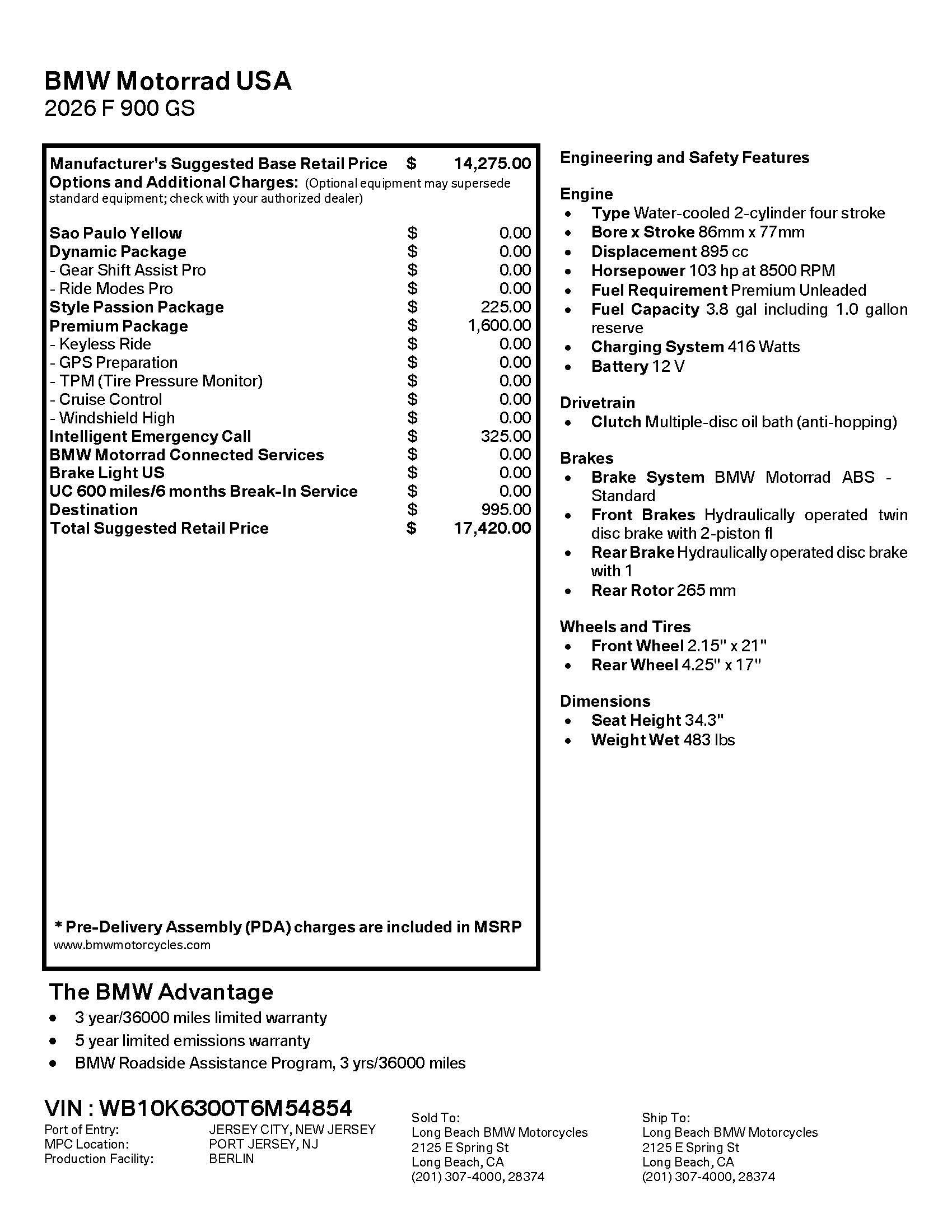 • Achieve everything with the right drive: Whether you're on the straight asphalt or rough terrain: the parallel-twin engine of the F 900 GS delivers maximum riding pleasure on every surface. Two-cylinder in-line engine offers more peak power with an improved torque curve. With its optimized power curve, the F 900 GS reaches a peak output of 105 hp at 8,500 rpm. The broader torque curve offers up to 68.6 lb-ft at 6,750 rpm.